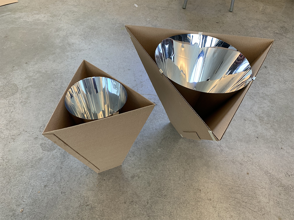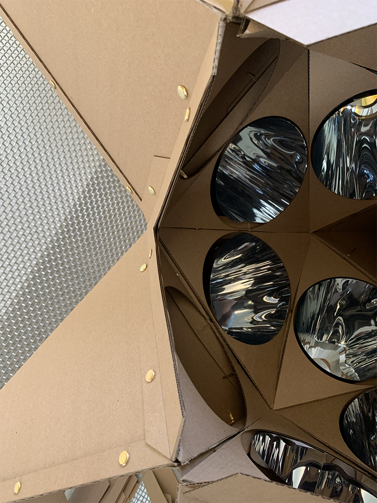 Inspired by the work of Haus-Rucker-Co in the 1960s and 70s, our studio designed “mind expander” devices - architectural experiences that provide unusual sensory experiences. Myself and the two other classmates focused on the power of mirrors to fascinate and disorient. By experimenting with flexible mirror paper, we discovered that a conically shaped mirror creates compelling visual stimulation when positioned close to one’s face. Multiplying that conical form into an icosahedron created a suspended head enclosure that disconnects users from the world, while reconnecting them to their senses. The visual effect was supplemented by a speaker positioned in the top cone that played audio from a microphone, distorted using a custom program.