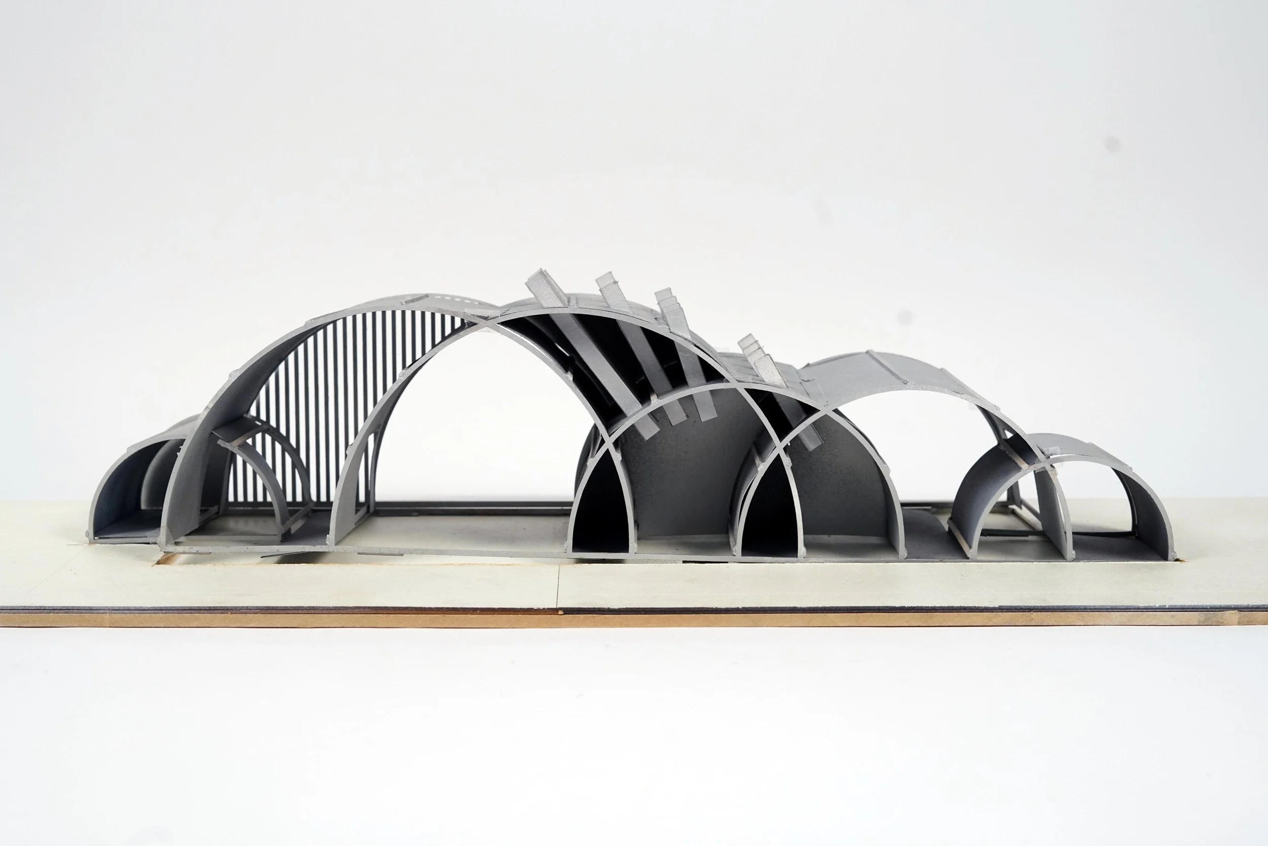 Pre-engineered building systems are ubiquitous, yet rarely acknowledged in professional architecture. For this studio, we deconstructed unconventional “readymade architecture” systems into a kit of parts, which we used to develop a single family home. I researched steel grain silos, simple structures composed of corrugated steel panels held together by bolts and fasteners. I rotated the system, converting the vertical silos into a horizontal Quonset hut construction. By intersecting half-cylinders of various sizes, I created a variety of unique rooms. Silo door frames cut through the walls to produce an unconventional recreation of a traditional enfilade. Metal silo floor panels become side walls, and allow the walls to vary from opaque, partially glass, or fully glass, depending on the needs of the space. Grain feeder tubes are converted into skylights, puncturing the roof and ceiling surfaces to provide light into the bedrooms.